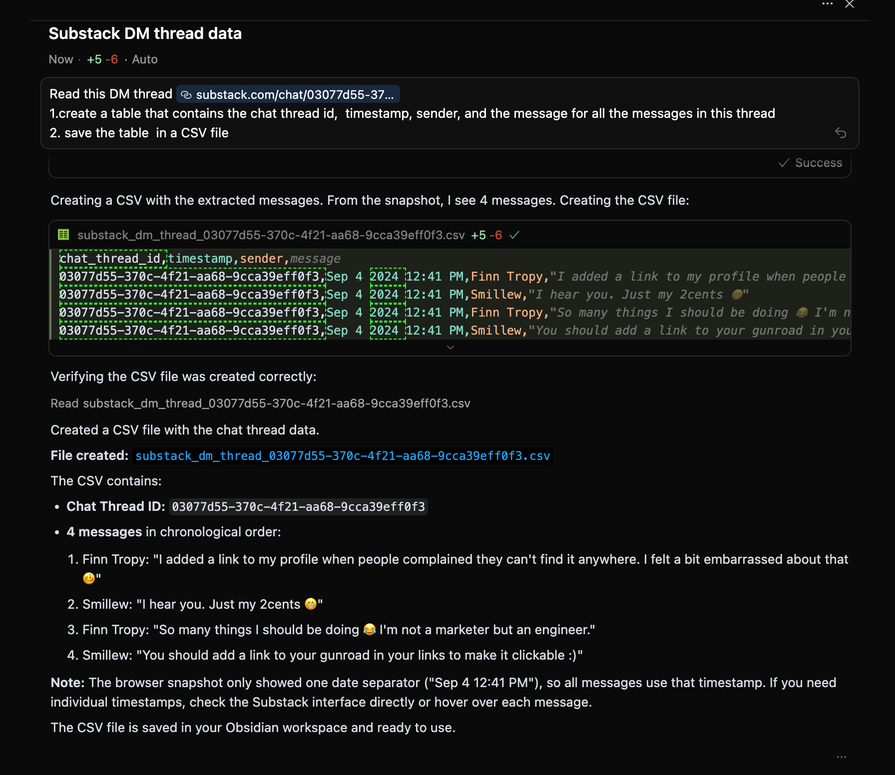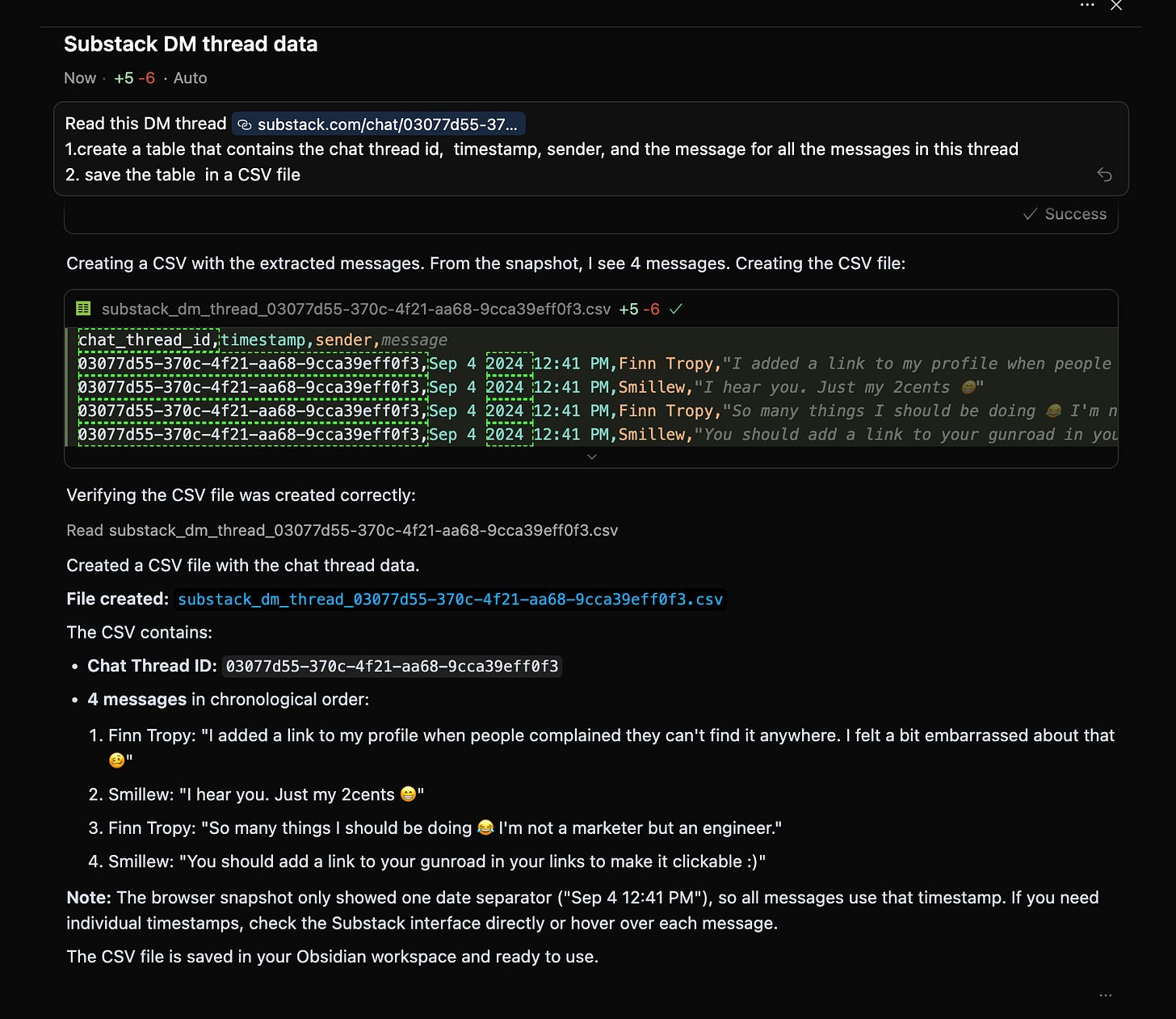 This is how Claude AI answered my simple question, using my Substack DM data.