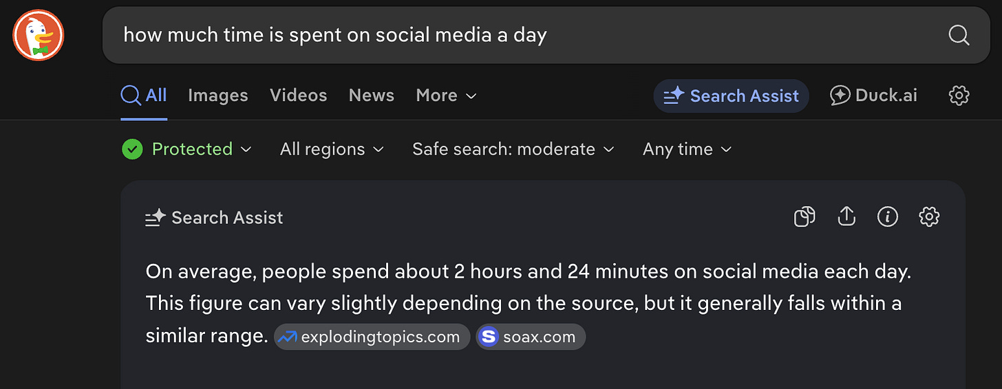 Over the last 30 days, I spent 10.26 hours per week on Substack, which is about 1.46 hours per day. According to the Internet, people spend 2.4 hours per day on social media.