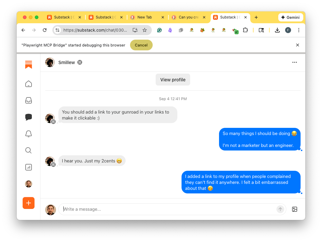 You can see this message “Playwright MCP Bridge” started debugging this browser: