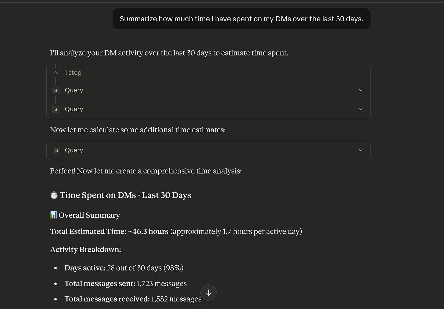 “Summarize how much time I have spent on my DMs over the last 30 days.”